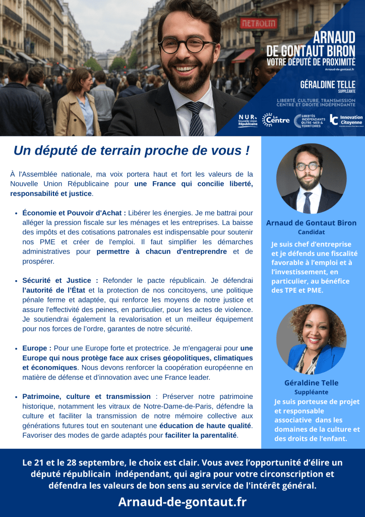Paris est ma ville. J’y vis, je m’y engage et je souhaite aujourd’hui mettre mon expérience et mes valeurs au service de l’intérêt général. J’ai l’honneur d’être investi par la Nouvelle Union Républicaine, un mouvement qui défend un juste équilibre entre liberté économique et justice sociale, tout en affirmant son attachement à une Europe forte et respectueuse des nations.